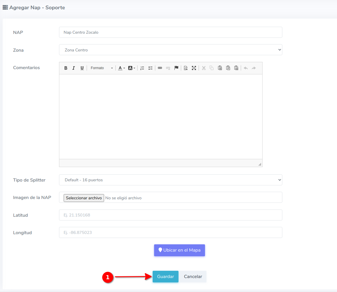 3Ahora se nos mostrara un formulario donde le asignaremos un nombre, una zona, descripción y la ubicación. Una vez hecho esto debemos seleccionar la opción guardar. Esto agregara la Nap al sistema y podremos usarla.