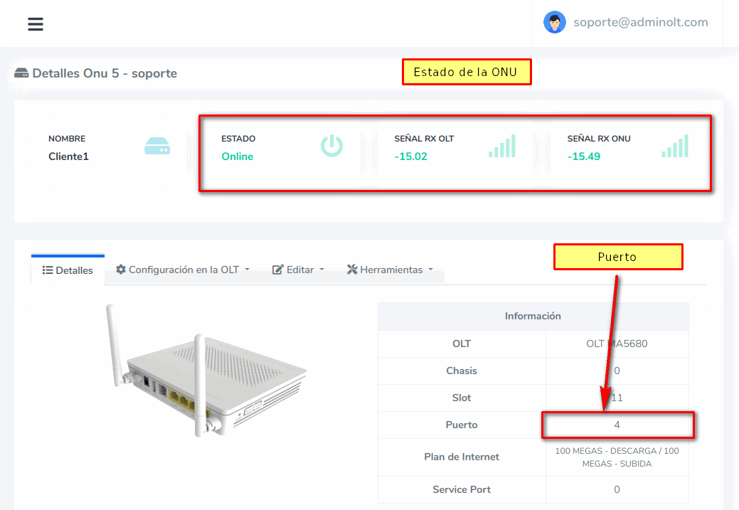 1 Verificar que nuestra ONU tenga señal y este Online
