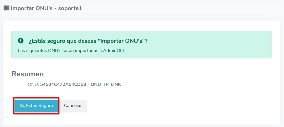 3Una vez que hayamos seleccionado los equipos, importamos las ONU's al sistema AdminOLT