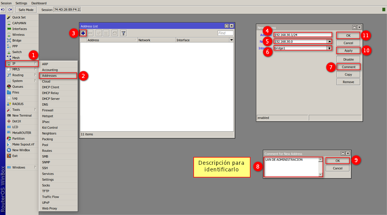 Nos dirigimos al apartado de Bridge en el menú de nuestro RouterBoard para generar la interfaz bridge1 y así poder agrupar los puertos que estarán trabajando en la red de la OLT.
