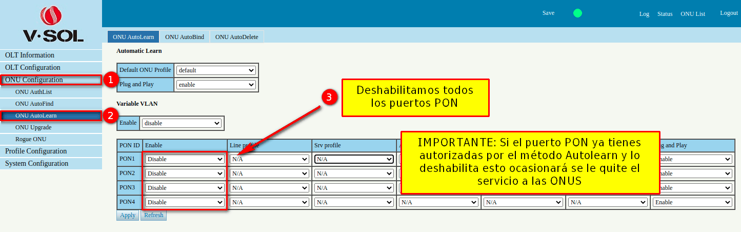 La primera parte del manual especifica como podemos habilitar los puertos PON desde AdminOLT, la segunda parte nos da instrucciones de como deshabilitar el modo Autolearn del puerto PON pero este proceso se realiza dentro de la interfaz de la OLT.