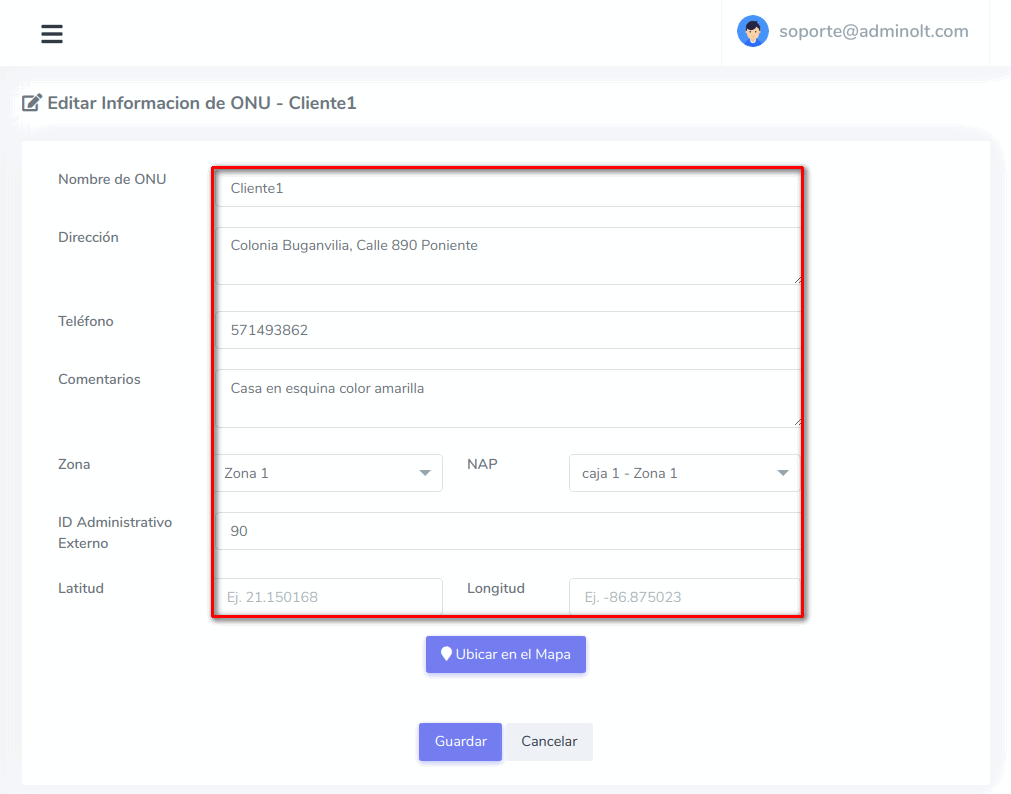 Para poder editar información en AdminOLT puede seguir los pasos del siguiente apartado Pasos para editar información de ONU Autorizada en AdminOLT