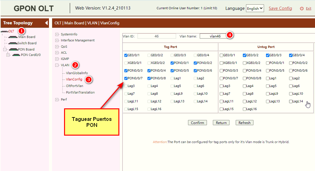 4En la OLT se debe de Taguear los puertos PON en la VLAN