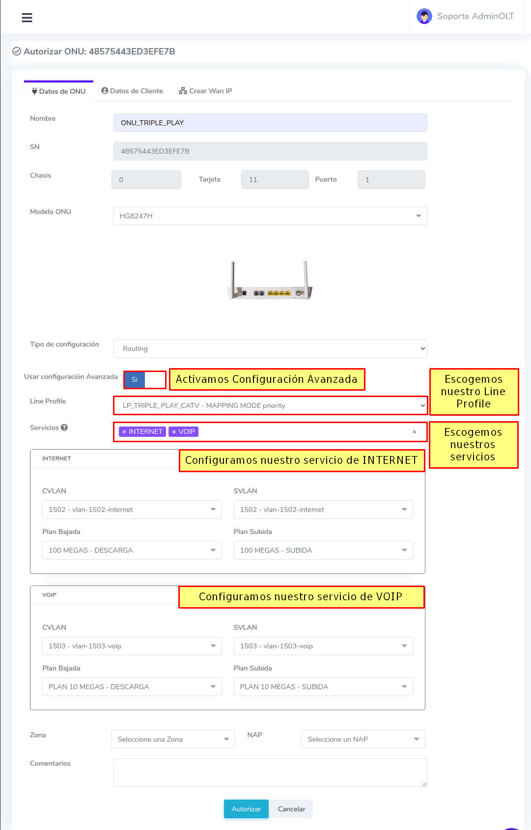 Autorizamos la onu y habilitamos la opción de configuración avanzada