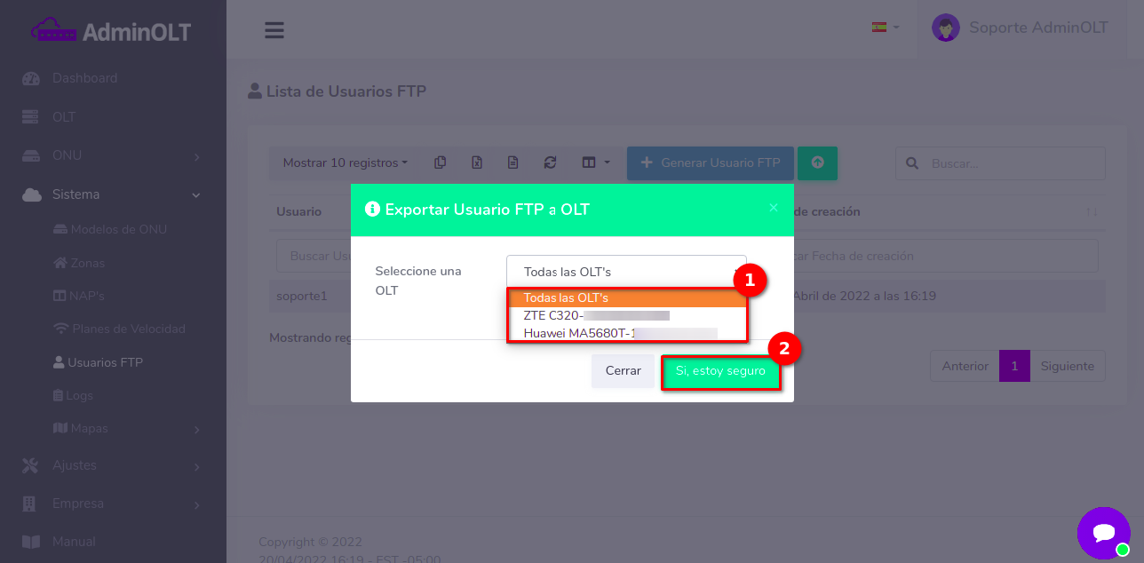 Puede seleccionar una o todas las OLT's que tenga registradas, a las cuales se exportara la información del usuario recién creado en el sistema AdminOLT